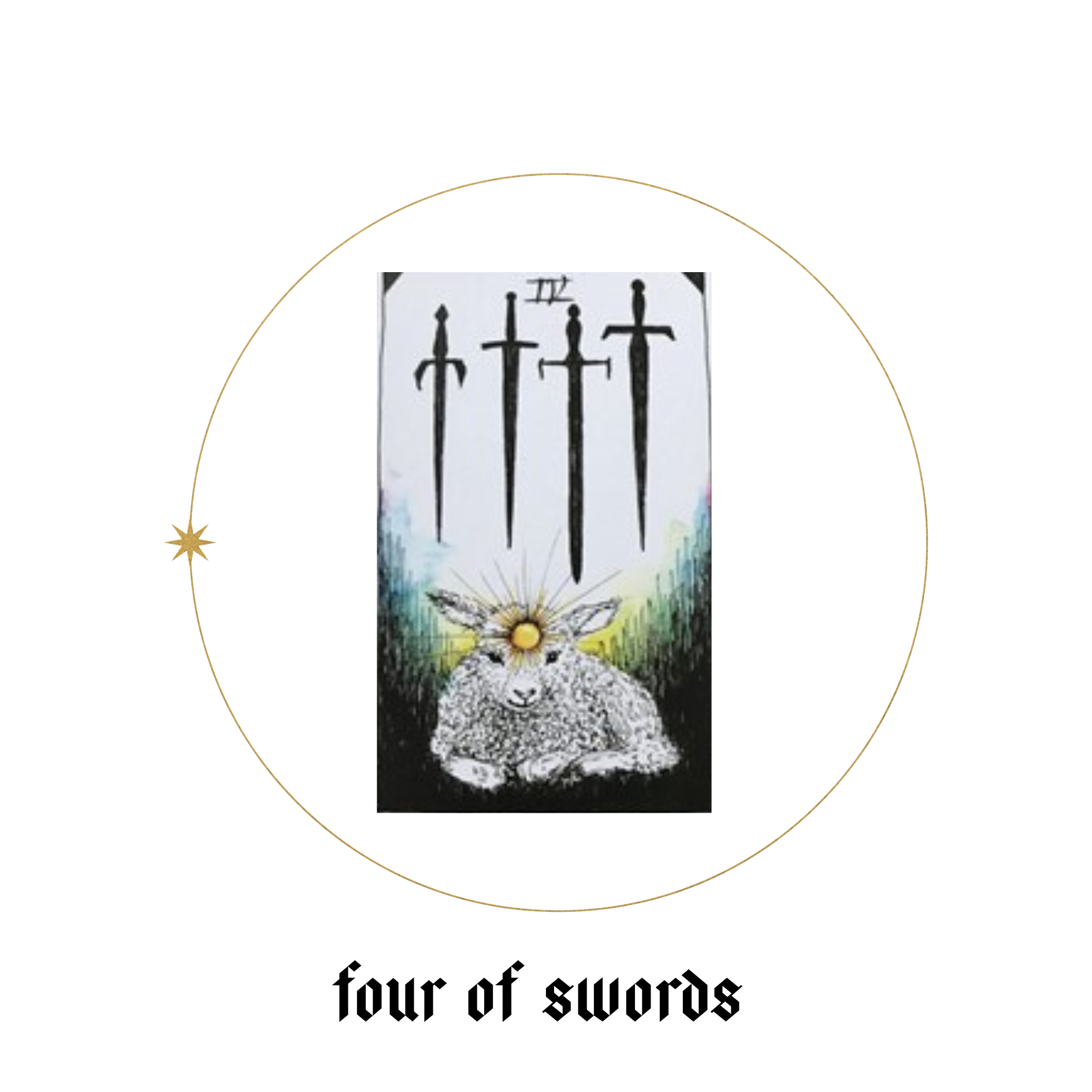 The aerialist reminds us of the possibilities of this card, just as the telepathic lamb controlling the swords above her head: it is possible to wield mass, force, and energies that feel chaotic in the service of a singular goal.